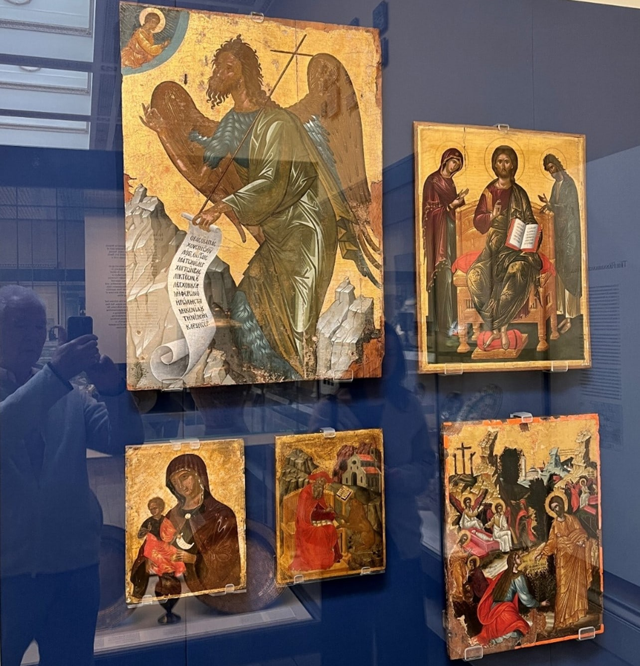 Recently put on display in Room 46 without fanfare or announcement are these five magnificent Cretan icons. The two on the left, St John the Baptist and the Madre della Consolazione, were formerly in the Temple Gallery. (Note the reflection of me on the left photographing.)