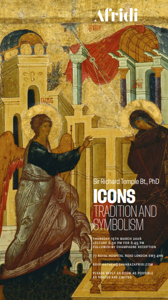 Dick Temple will be giving a lecture on 'Icons: Tradition and Symbolism' at the Afridi Gallery, 77 Royal Hospital Road, on Thursday 19th March, at 6.45pm. To reserve a place, please RSVP to Anthea Roberts: anthea@shahbazafridi.com